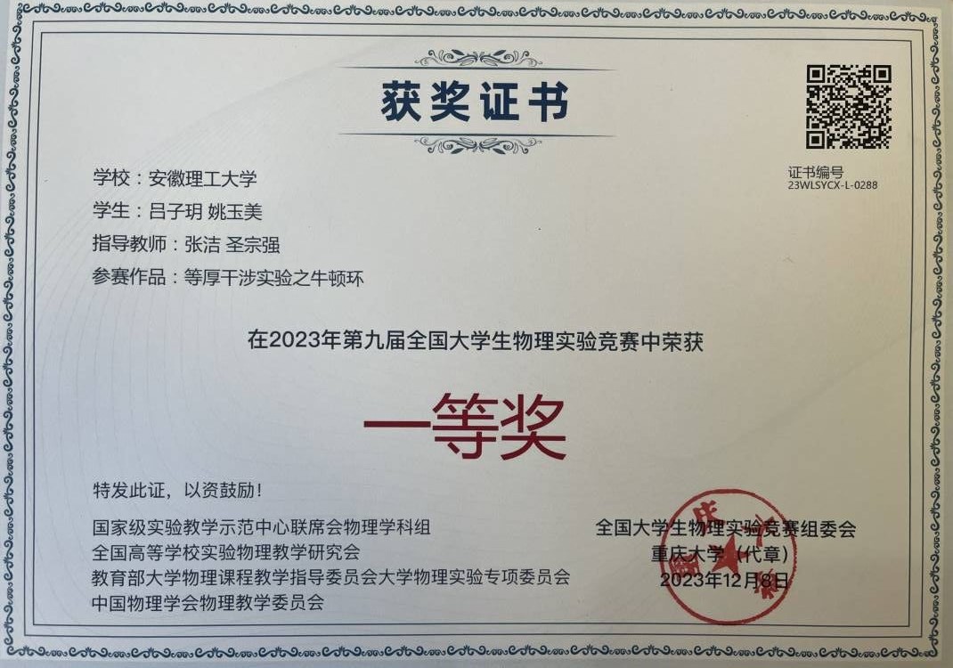 11月26日,第九届全国大学生物理实验竞赛总决赛(创新)在重庆大学落下帷幕,我校我院2022级光电信息科学与工程专业本科生姚玉美、吕子玥同学荣获一等奖,取得我校迄今在该项赛事中最佳成绩。