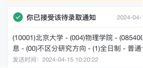 进入大学,沈东阳便有了考研的想法,大一即坚定了考研北大的目标和梦想,他经常和朋友说考研考北大,是此生仅有的机会,自己绝不退缩、绝不给自己遗憾的机会,所以他加倍努力,以终为始。大一开始打好英语、数学等功课基础;大二大三开始收集考研相关信息,做好专业课的准备。2023年2月开启专注高效的考研之旅,坚定的目标和梦想像灯塔一样指引着考研航行的路线。学习到瓶颈、感觉坚持不下去的时候,就盯紧目标,将考取目标大学作为激励、不断激发内生动力。有时学习了一天、回到寝室倒头就睡,睡着了会做在北大求学的梦。醒来发现是梦之后,没有恍惚,而是将梦境升华为继续前行的动力,不畏艰辛地一路追求,终于在2024年4月收到拟录取通知,成功上岸北京大学物理学院电子信息专业。
