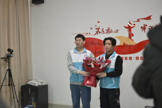 欢送会上,国寿财险公司负责人向许梓强同学捐献志愿者意外伤害保险。已捐献者冯魏交流捐献经历,并为许梓强献花。