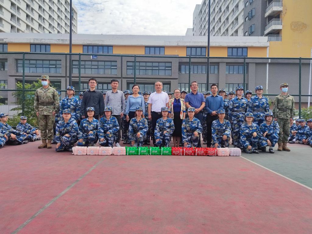 训练间歇,学院领导为新生和教官送上了军训的慰问品。