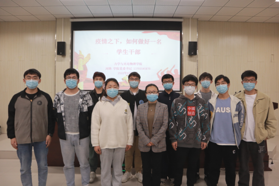 刘艳指出,当前疫情防控形势严峻,安全工作是一切工作的基础和保障,是各项工作的重中之重,学生干部是疫情防控的“神经末梢”,要牢固树立安全意识,始终绷紧安全这根弦。她希望全体学生干部:一是提高站位,强化责任担当。疫情防控关乎在校师生生命安全和身体健康,学生干部一定要提高思想认识,构筑好班级疫情防控的严密防线;二是发挥作用,带头遵守学校纪律。学生干部一定要守土有责,带头遵守疫情防控等相关管理规定,反映迅速、服务到位;三是落实责任,畅通信息渠道。学生干部要把校园安全意识、疫情防控知识宣传到每一位同学,落实好网格化管理制度,认真开展好每一次班级疫情防控工作排查,不留死角。