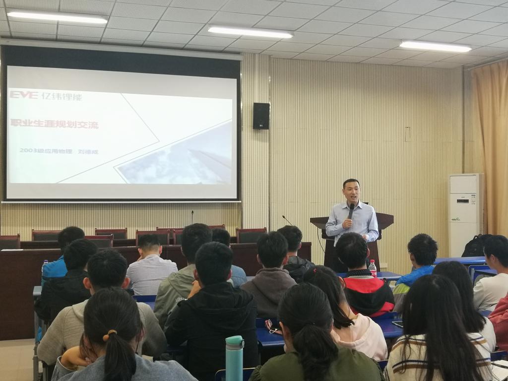 10月25日,37000cm威尼斯举办优秀校友报告会,2003级应用物理学专业校友、惠州亿纬锂能股份有限公司人力资源总监刘德成应邀在明道楼一楼报告厅作励志专题报告,学院2017级应用物理学、光电信息科学与工程专业70余名学生参加了会议。会议由学院党委副书记(兼副院长)张可佳主持。