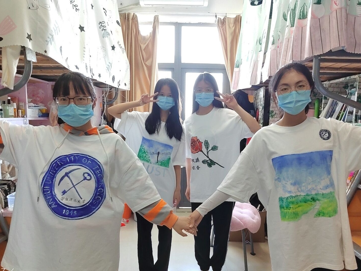 接到捐赠的T恤,同学们既高兴又感动,向爱心校友表示感谢。“不论什么专业,无论毕业多久,安徽理工大学是我们共同的名字!”有绘画爱好的几个女生,在爱心T恤上绘制了母校校徽和风景留作纪念。学生们纷纷表示将持续勠力同心、众志成城、共克时艰,为打赢这场疫情防控战贡献力量。疫情防控,我们“衣”起加油!