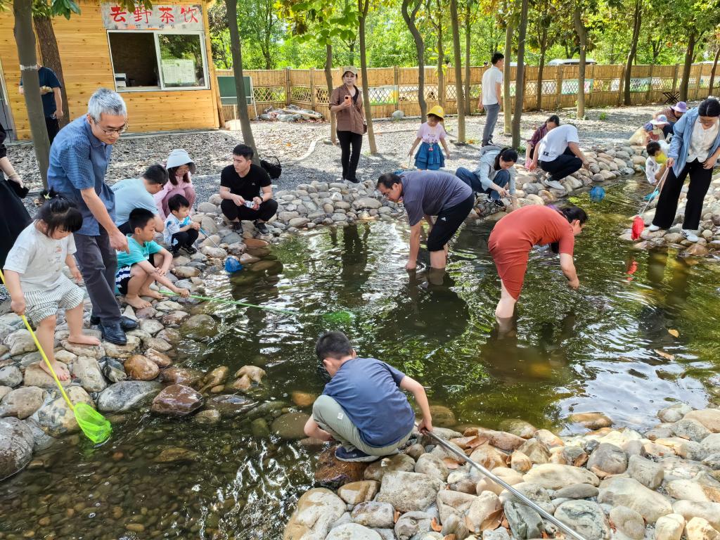 流水潺潺,绿树成荫,在这样一番宁静雅致的乡村池塘边,每个亲子家庭为一组,孩子们纷纷挽起裤脚,光着脚丫,拿着各色各样的小桶下池捞鱼,兴高采烈地与家长配合,收获颇丰。还有不少孩子用竹子和鱼线自制钓虾竿,坐在凳子上,手拿钓虾竿,不一会身旁的小桶中装满了鱼和虾。