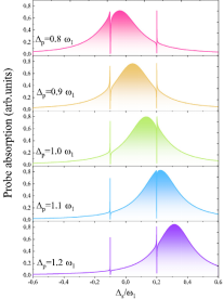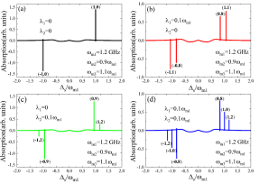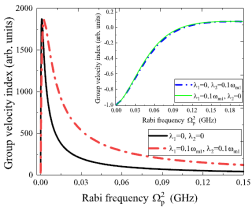 图1 (左图)共振条件下的探测吸收谱;(右图)不同耦合机制下的群速度。
