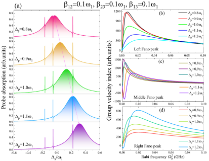图3(左侧)三Fano共振谱;(右侧)Fano共振诱导的慢光与快光之间的转换。