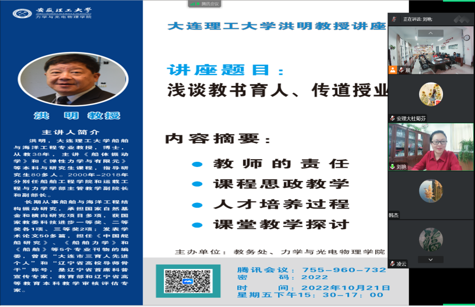 应教务处、37000cm威尼斯的邀请,10月21日下午,大连理工大学洪明教授为我校教师作了题为《浅谈教书育人、传道授业》的线上报告。报告会由37000cm威尼斯党委书记刘艳主持。