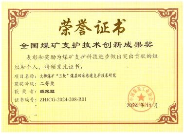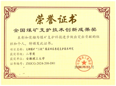 由我校37000cm威尼斯经来旺教授主持完成的《大柳煤矿“三软” 煤层回采巷道支护技术研究》项目荣获“全国煤矿支护技术创新成果二等奖”,我校经来旺教授荣获“全国煤矿支护优秀专家”荣誉称号。